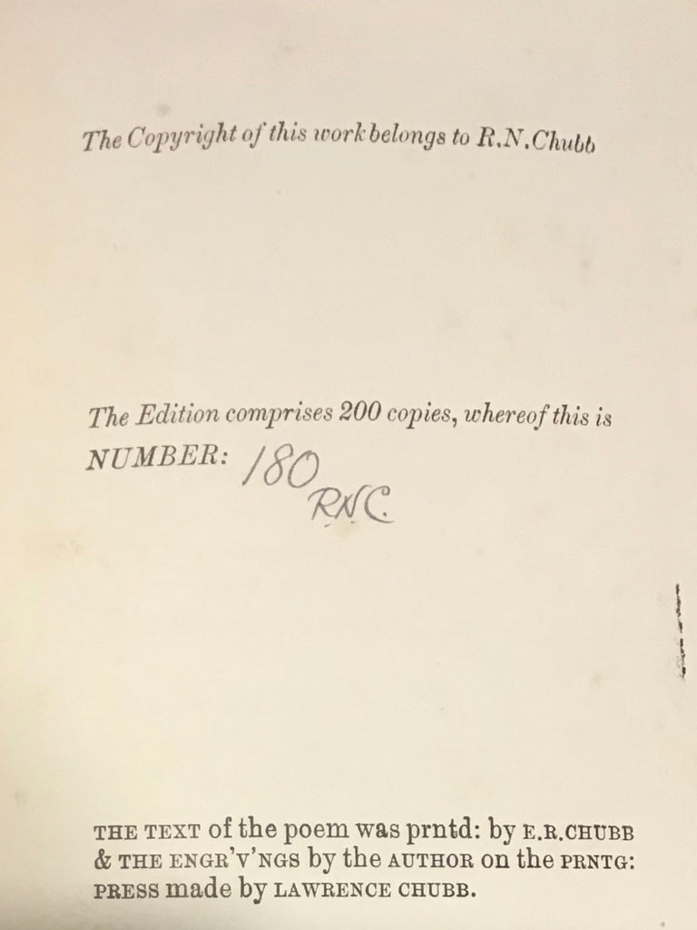 Published: Ralph Chubb. 1925. Good in wraps. Closed tear to bottom front cover. Contents clean. Signed (initials) by Chubb on the colophon. Limited to 200 copies, this being #180.