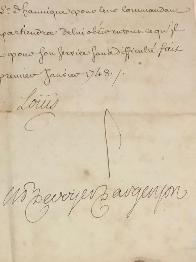 Signed (with Masonic signature) by King Louis XV, and co-signed by Minister of War Comte d'Argenson.