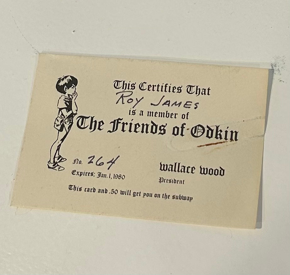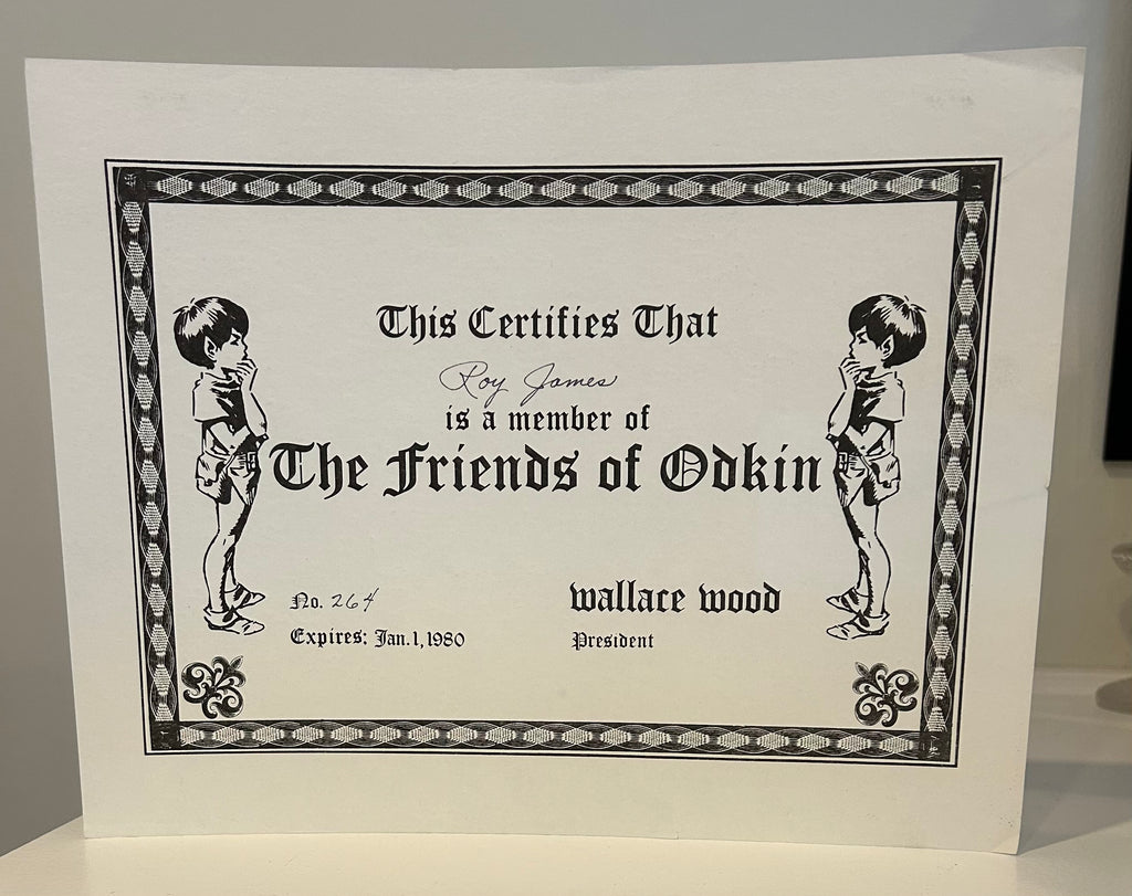 Near the end of his life Wallace Wood began a subscription based club called The Friends of Odkin. For joining you would receive an original, signed ink drawing of one of the characters from Odkin, in this case Sally. You would also receive a certificate of membership, a wallet-size membership card and an Honorary Diploma. All of these are offered for sale with this listing. The membership card has some paperclip residue. There are two paperclip shadows on both the certificate and diploma. The items are in otherwise Fine condition.